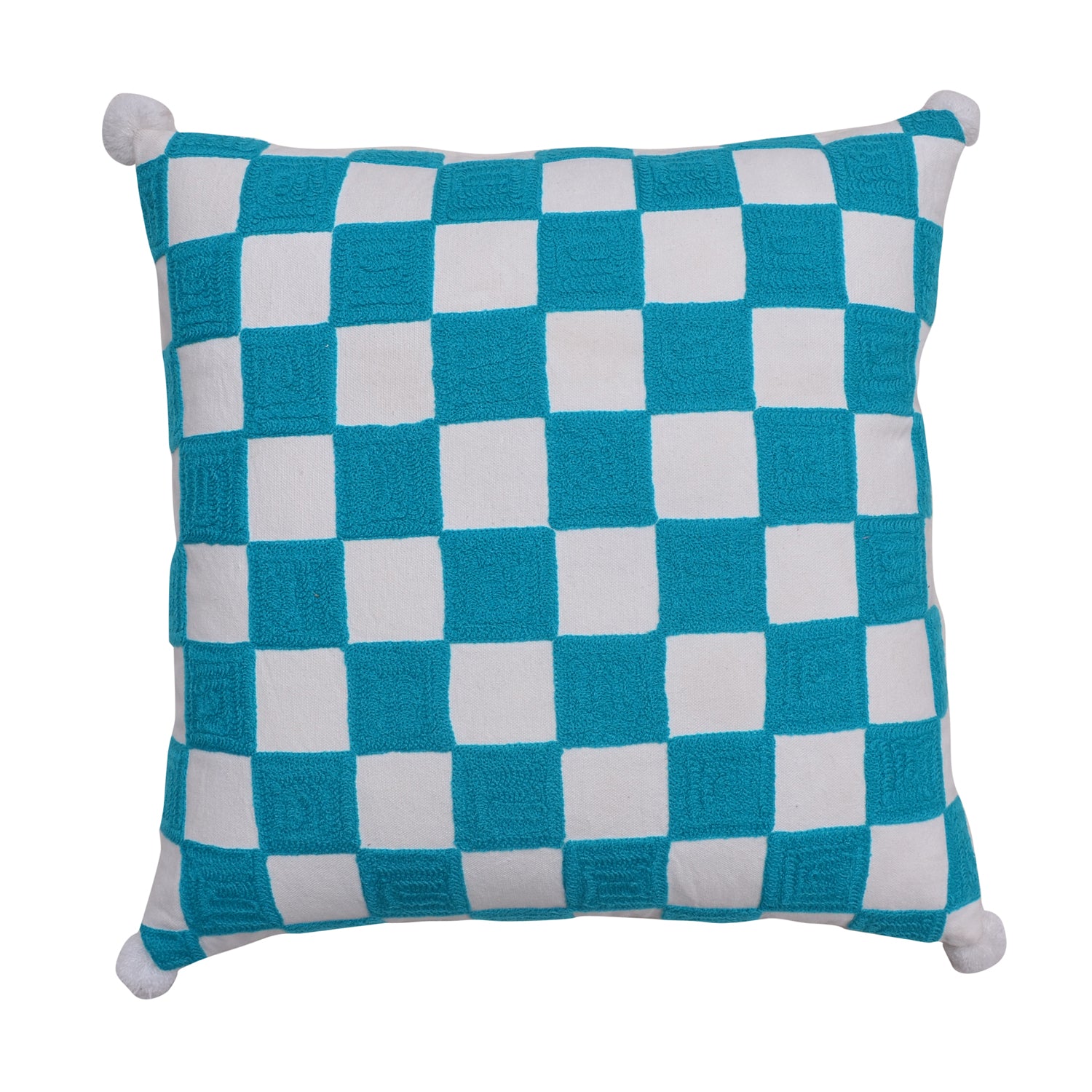 Aqua Checkered Hand-Embroidered Cushion Cover