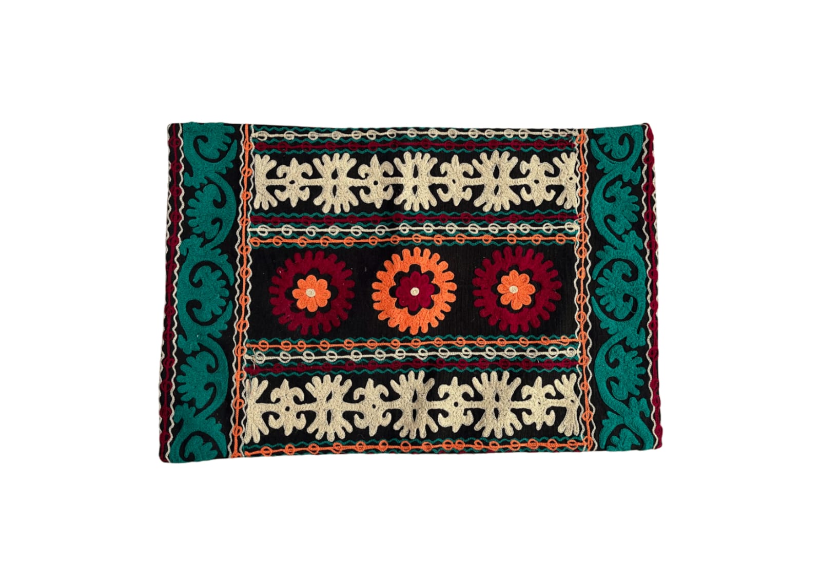 Add a burst of color and culture to your space with our Boho Folk Bloom Handmade Pillow Cover. Inspired by traditional Suzani embroidery, this artisan-made piece features bold floral motifs and intricate threadwork in rich teal, maroon, orange, and cream tones on a black base.