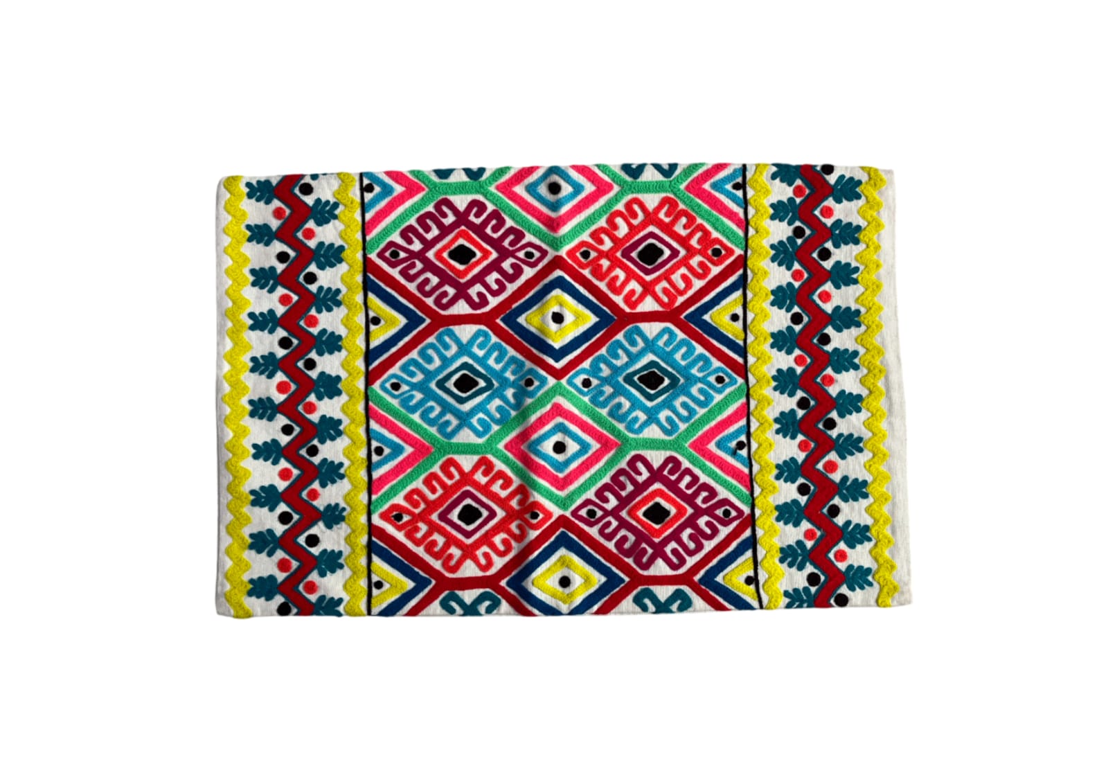 Make a bold statement with this Colorful Geometric Tribal Embroidered pillow cover, featuring vibrant diamond and zigzag motifs stitched in vivid hues of red, teal, blue, pink, yellow, and white. Inspired by traditional Central Asian and tribal patterns, this handcrafted textile brings energy, culture, and creativity to any space.