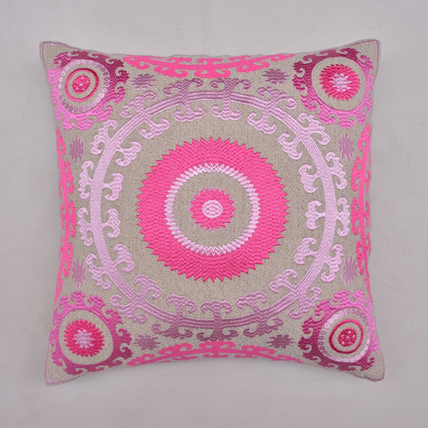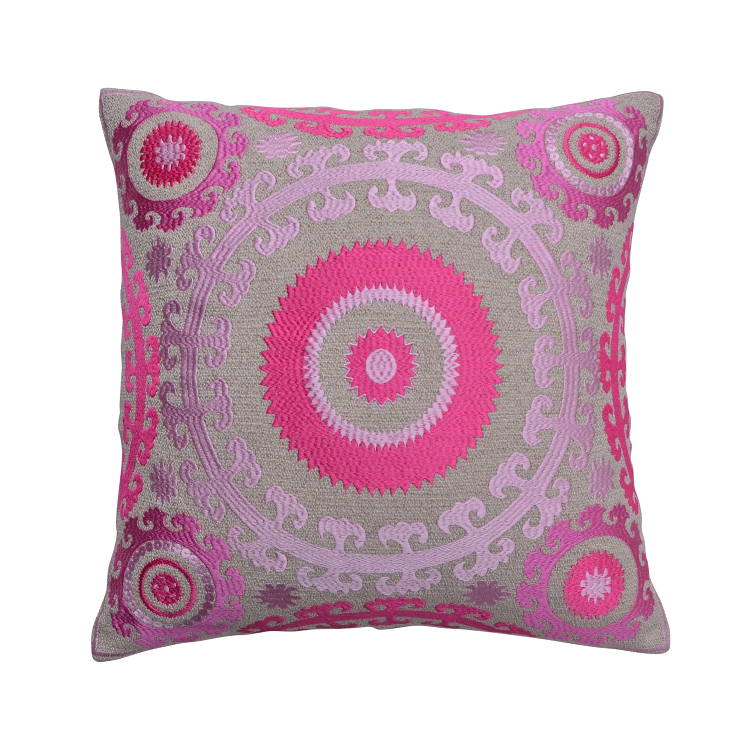Add a bold splash of elegance to your home with the Fuchsia Mandala Embroidered Accent Cushion. This striking cushion features a mesmerizing circular mandala pattern in vibrant shades of fuchsia, pink, and lilac, meticulously embroidered on a soft beige cotton base. The symmetrical design brings a sense of balance and artistic flair, making it a standout decor piece.