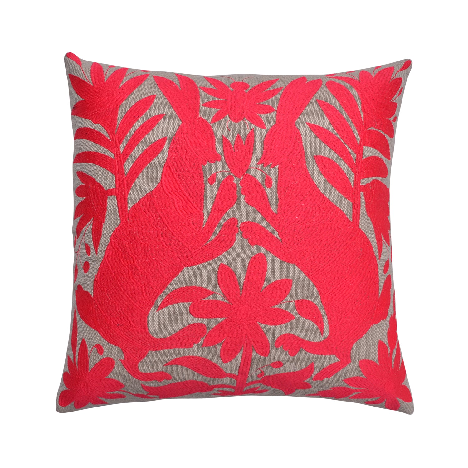 Bring a bold splash of tradition and charm into your home with the Otomi Inspired Bunny Embroidered Throw Pillow. Featuring a stunning hot pink embroidery on a natural beige canvas, this pillow showcases two playful rabbits surrounded by vibrant floral motifs—an homage to traditional Otomi textile art from Mexico. The high-quality stitching and whimsical design make it a standout piece for any living space, whether you're going for folk-art flair or eclectic chic.