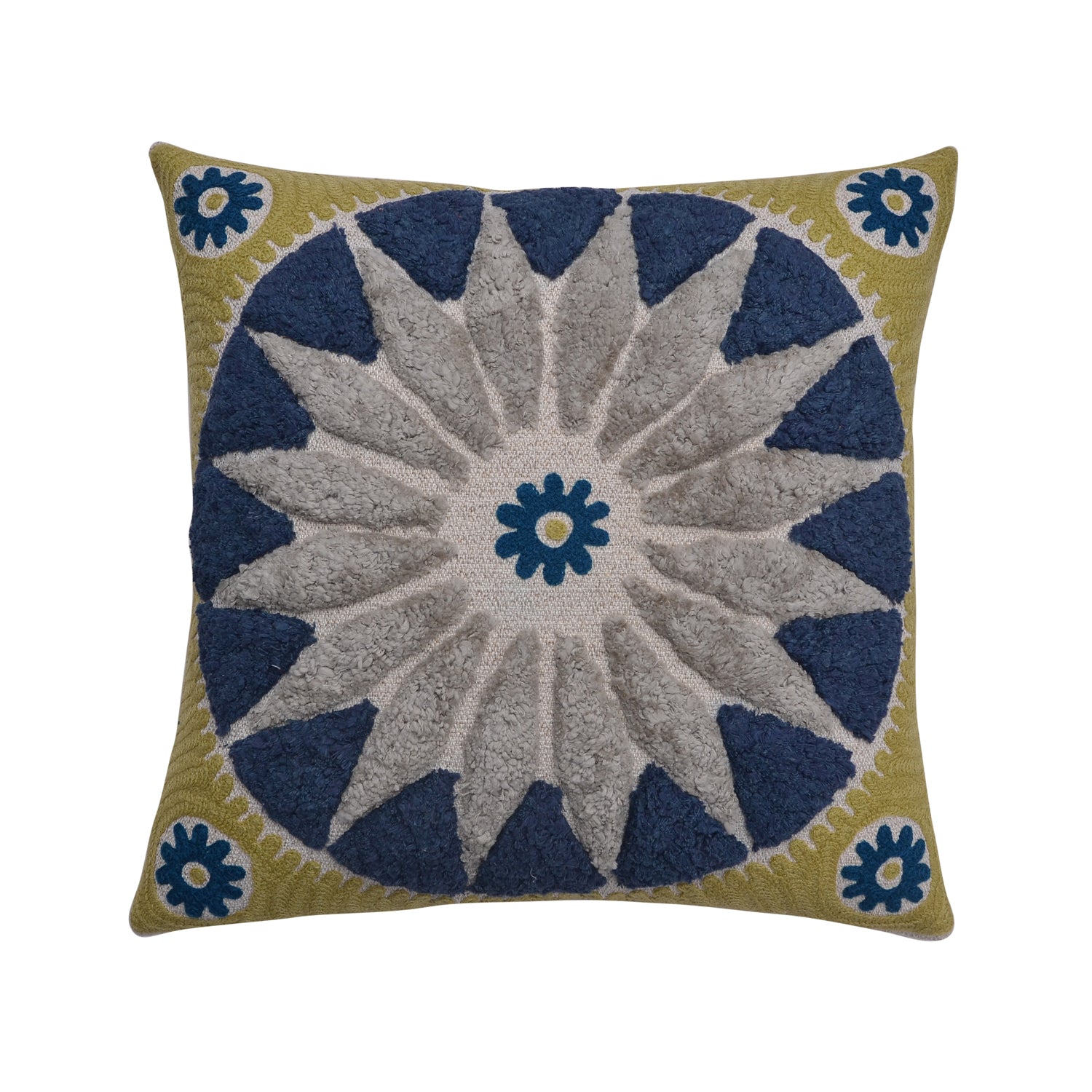Textured Sunburst Tufted Throw Cushion – Blue, Grey & Olive