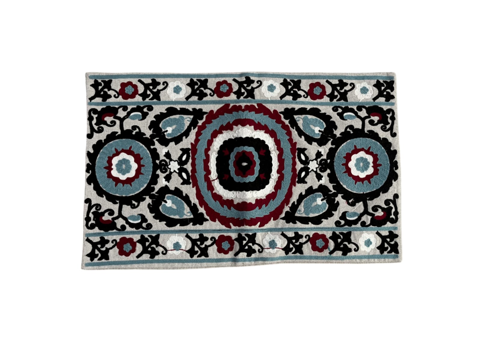 Bring a touch of heritage into your home with this Vintage Suzani-Inspired Embroidered Pillow Cover, beautifully designed with concentric medallions and blooming florals. Showcasing a traditional Central Asian motif, this handcrafted cushion cover artfully blends black, maroon, sky blue, and ivory tones for a rich, bold statement piece.